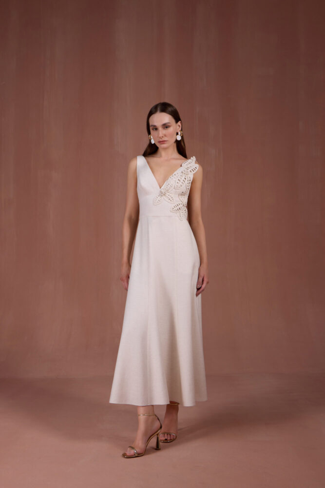 VESTIDO MIDI COM APLICAÇÃO FLORES